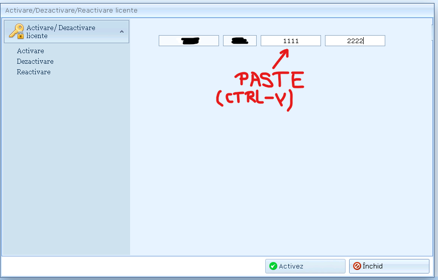 3. In fereastra noua alegeti sectiunea Activare si folositi functia Paste (ctrl-v) pentru a lipi codul nou de licentiere in ORICARE din casutele active.
