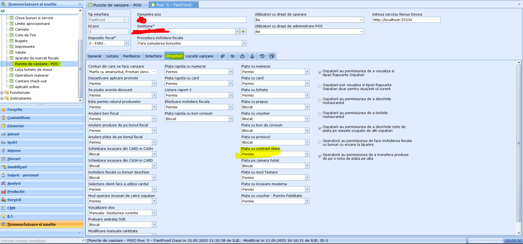 In primul rand, trebuie sa mergem in Nomenclator si Unelte → Puncte de vanzare (POS). Se selecteaza punctul de vanzare dorit, iar in fereastra Drepturi trebuie bifata optiunea Plata cu contract. (Atasez imagine).