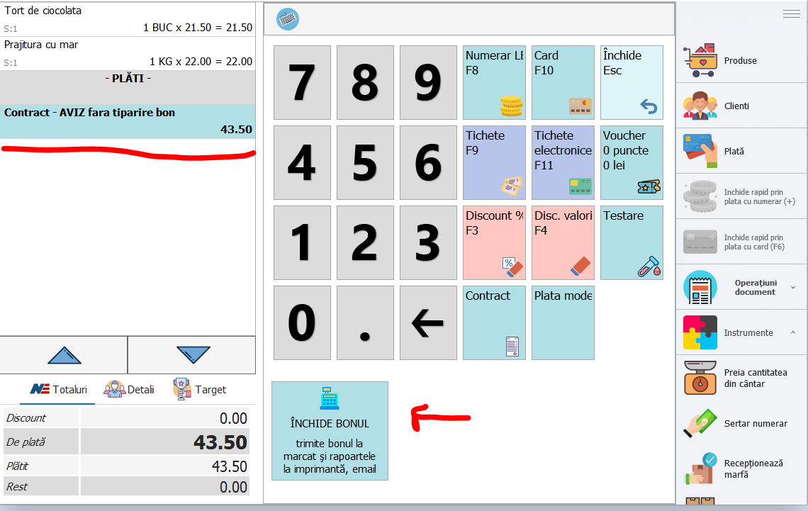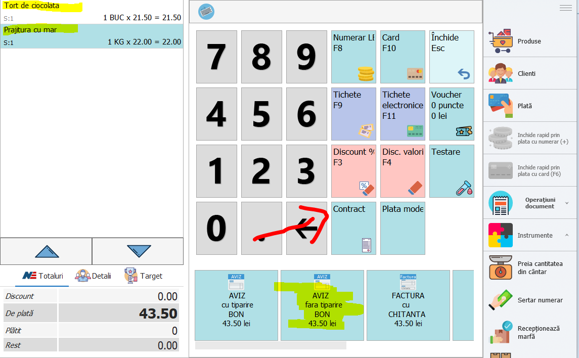 Deoarece am permis plata cu contract in EasyRetail, va aparea un buton nou, denumit Contract. Este important ca bonul sa fie inchis cu Aviz, fara tiparirea bonului fiscal (conform imaginii).