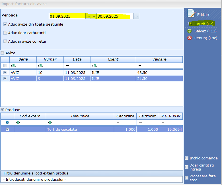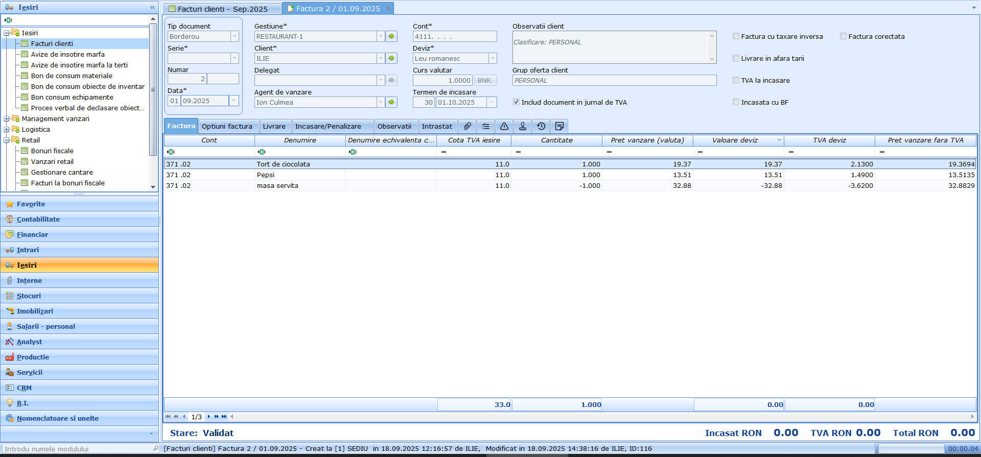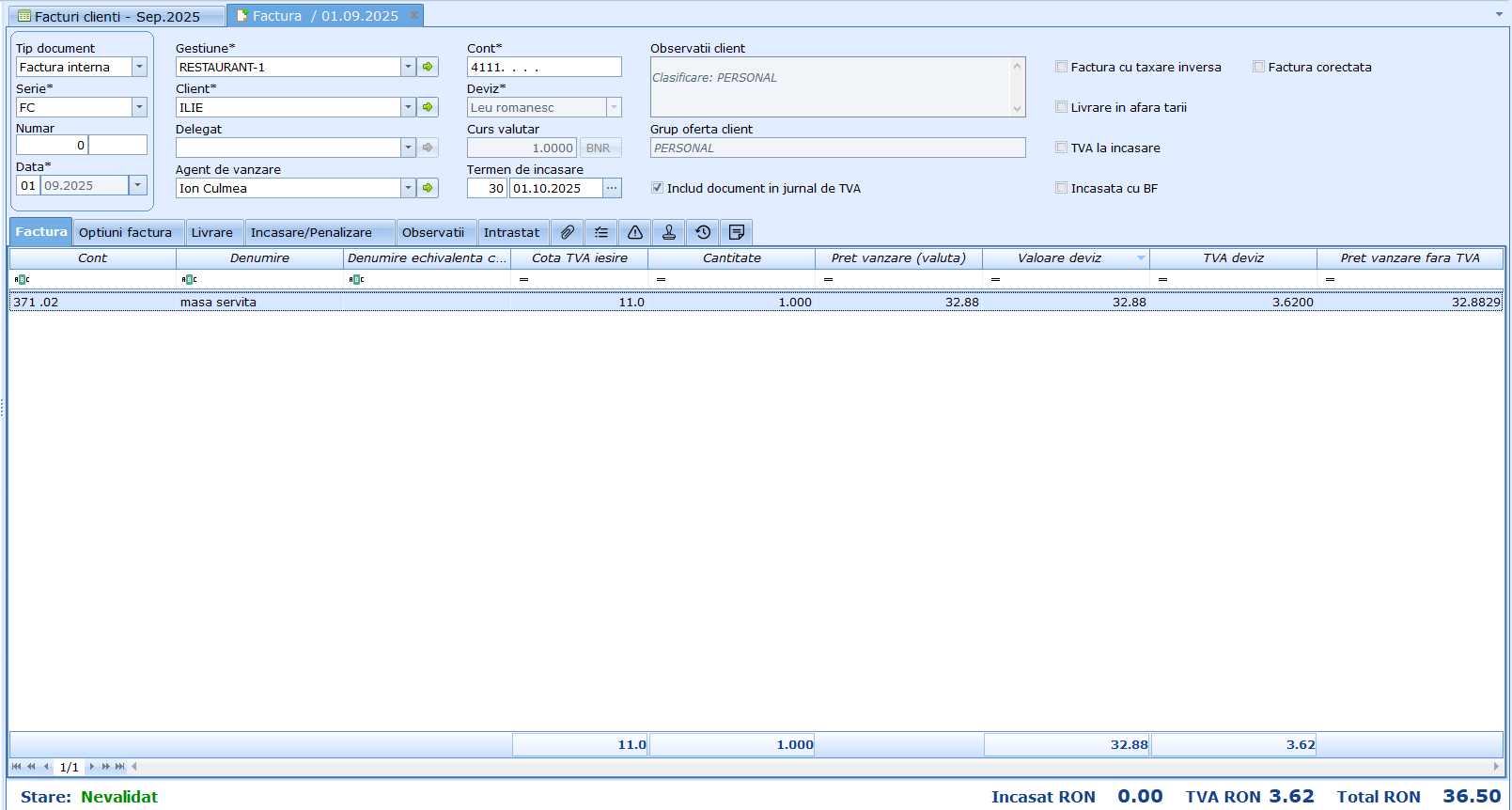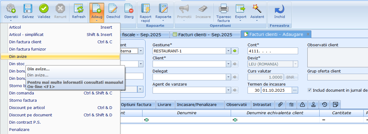 Mai intai, in Facturi Client, se selecteaza tipul de document Borderou, unde se adauga toate avizele cu cantitate + dupa acre adaugam o linie masa servita cu - borderoul trebuie sa fie total ron 0.00