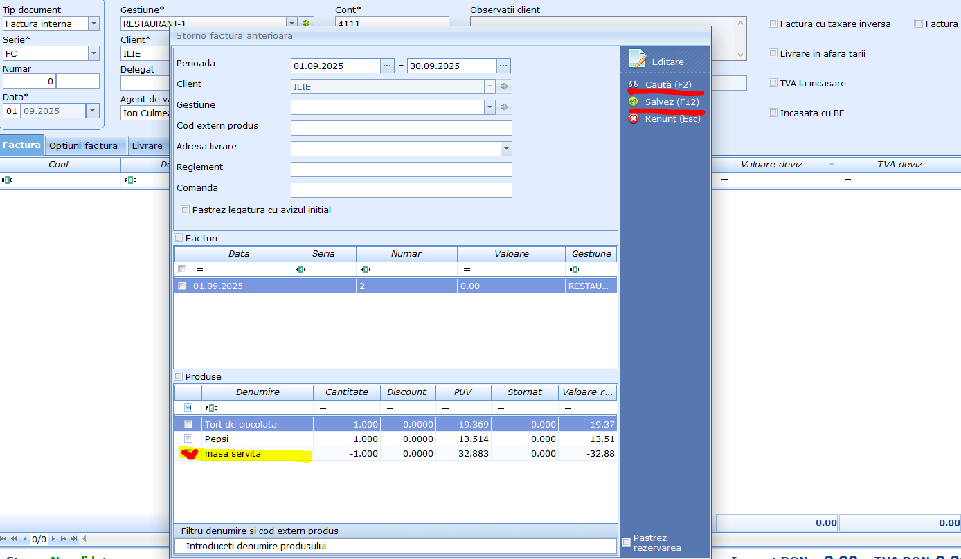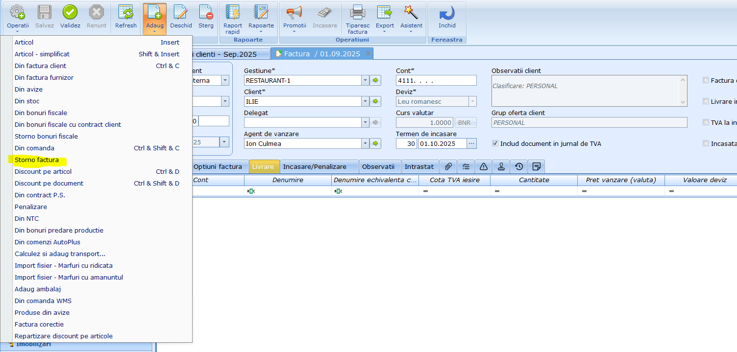 Dupa ce se creeaza borderoul, se va adauga o factura client de tip Factura Interna. Procedura este exact la fel ca la borderou: se selecteaza gestiunea si clientul, doar ca la adaugare se alege din storno factura.