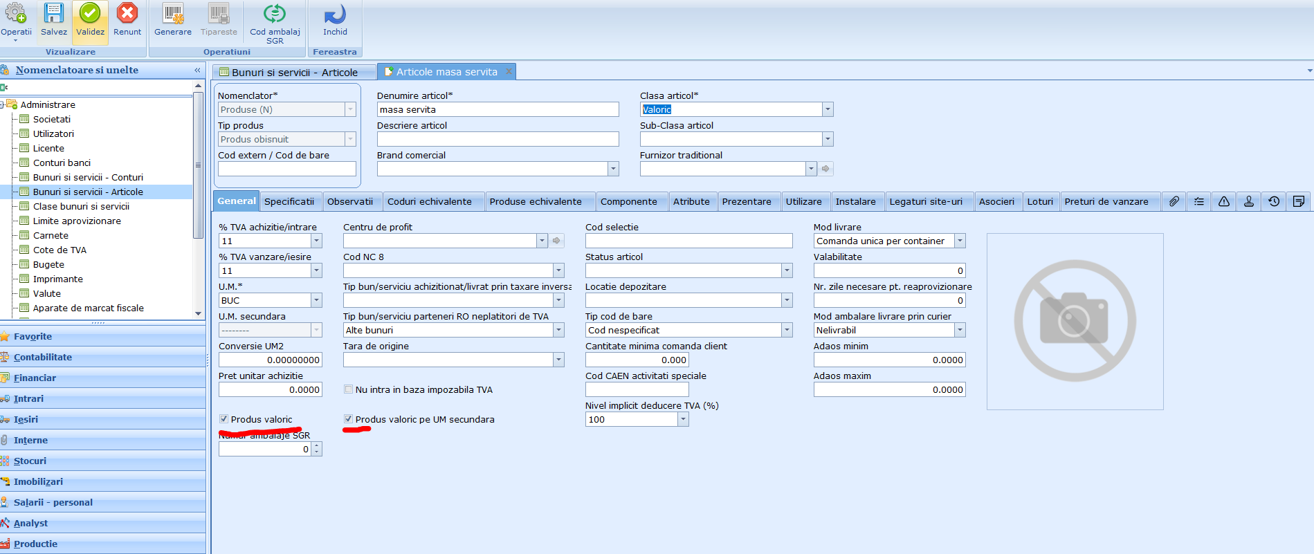 Daca se doreste emiterea unei singure linii in factura, este necesar sa se adauge in Bunuri si Servicii articole adaugam un articol de tip valoric, asa cum este prezentat in imaginea de mai jos: