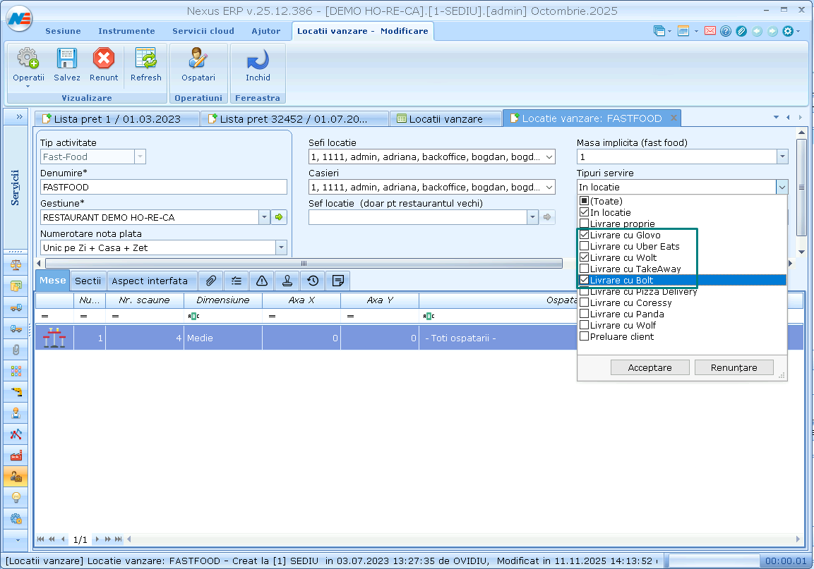 In modulul Servicii, Locatii vanzare se intra pe locatia sau locatiile configurate si se bifeaza in caseta Tipuri servire livratorii cu care se lucreaza.