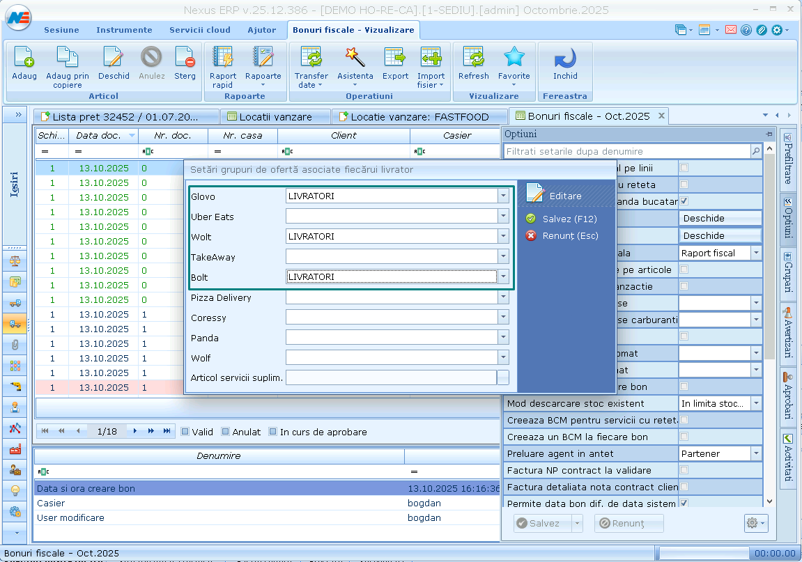 In optiunile modulului Bonuri fiscale se seteaza listele de preturi care se aplica livratorilor. Pot fi liste multiple create similar daca sunt preturi diferite pentru fiecare livrator. In cazul nostru avem o singura oferta destinata livratorilor asa ca alegem LIVRATORI la toti livratorii cu care lucram.